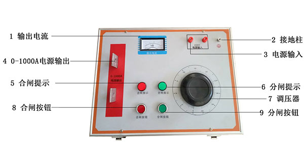 大電流發(fā)生器屬于JT型活動結(jié)構(gòu),紅色指示燈表示工作信號。操作面板由啟動按鈕(綠色)、停止按鈕(紅色)和工作系統(tǒng)組成。
