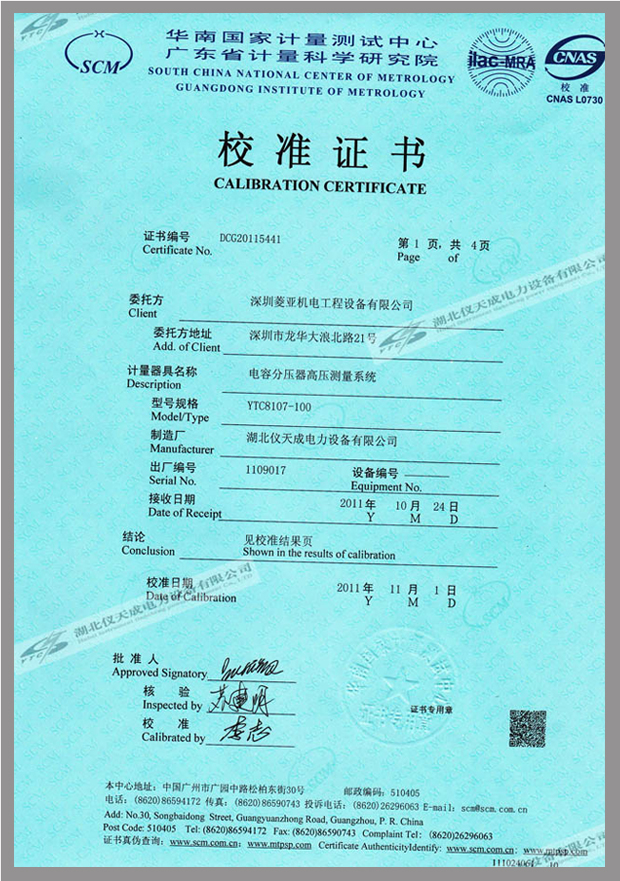 轉(zhuǎn)載:"YTC8107系列電容分壓器高壓測(cè)量系統(tǒng)鑒定證書" 請(qǐng)注明來源于儀天成電力。 更多技術(shù)問題請(qǐng)致電儀天成電力客戶服務(wù):027-87876585,技術(shù)部專線:027-87876585,在線客服:
